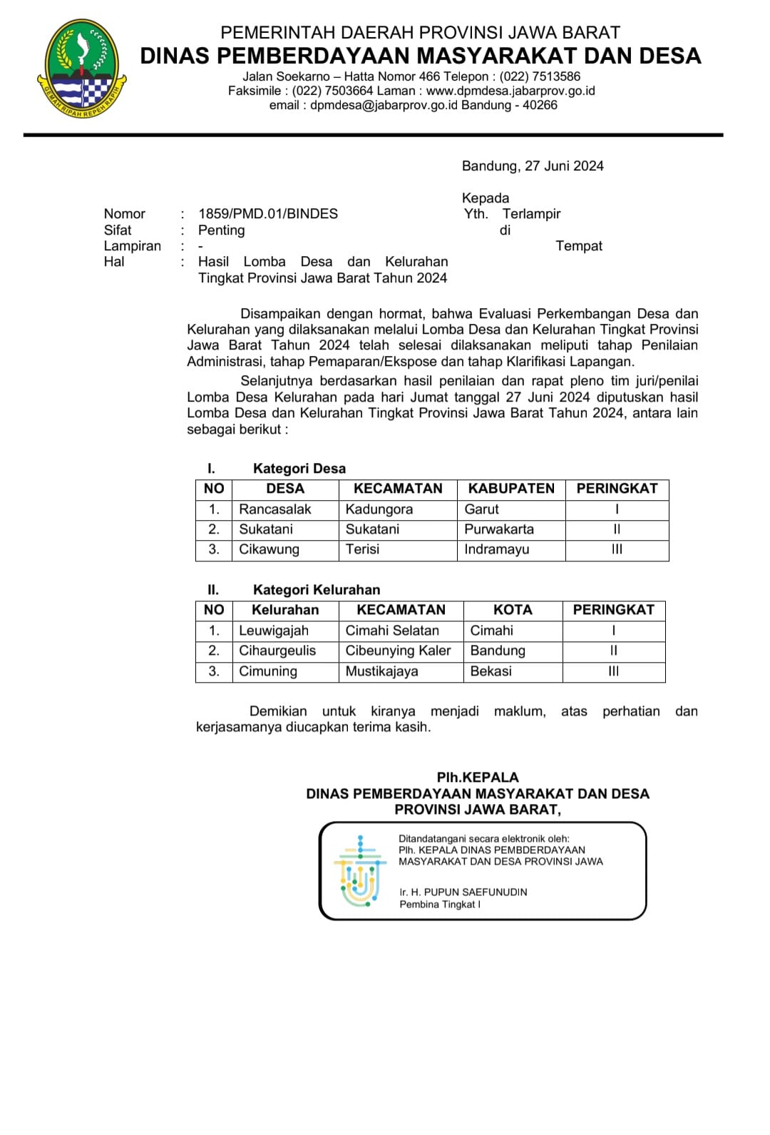 Pengumuman resmi dari Dinas Pemberdayaan Masyarakat dan Desa (DPMD) Provinsi Jawa Barat dengan nomor 1859/PMD.01/BINDES menetapkan Desa Rancasalak, Kecamatan Kadungora, Kabupaten Garut sebagai juara pertama. Desa Sukatani, Kecamatan Sukatani, berada di posisi kedua, disusul Desa Cikawung, Kecamatan Terisi, Kabupaten Indramayu di posisi ketiga.